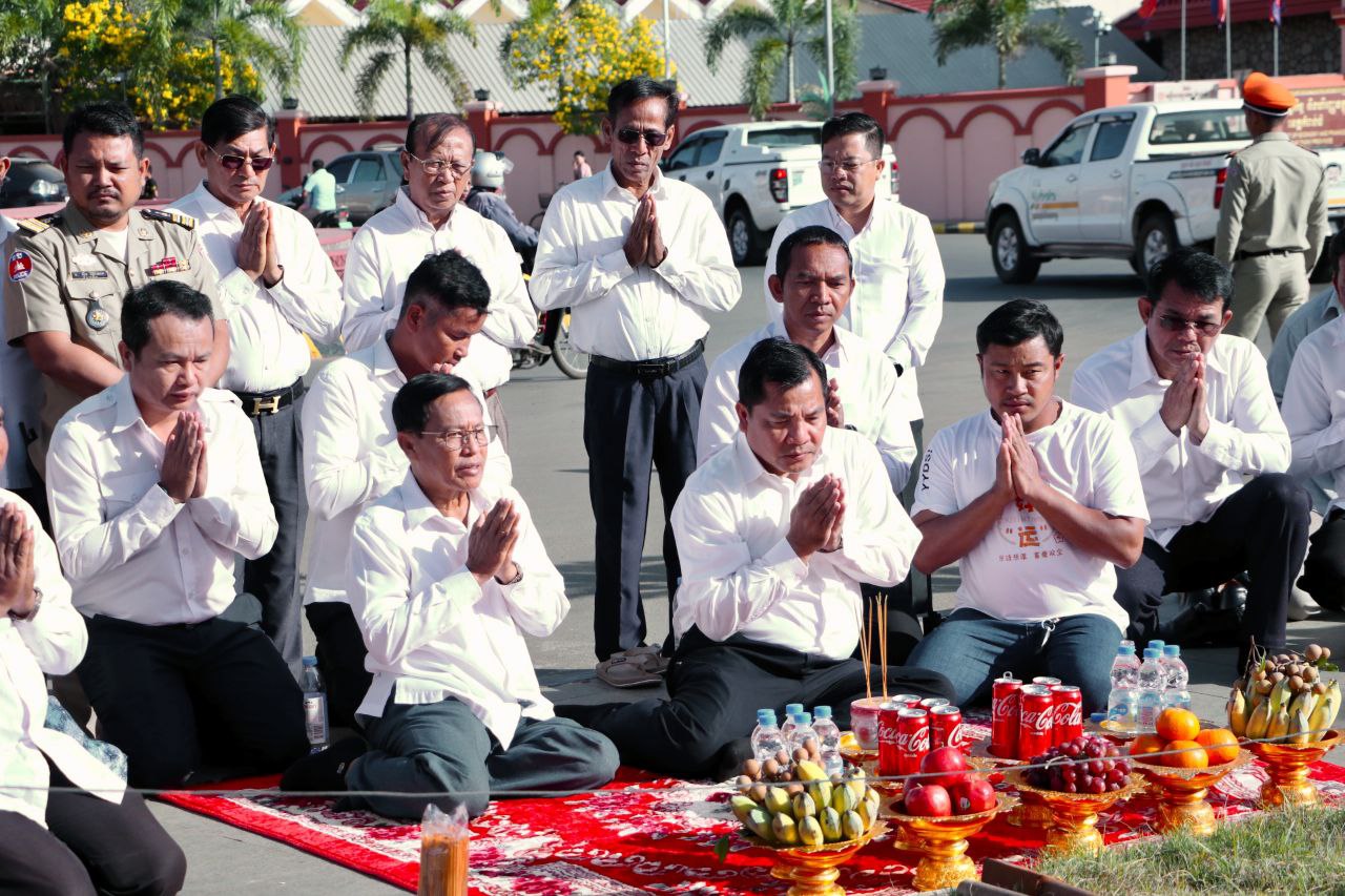 (កំពង់ធំ)÷ លោក ហុក រិន ប្រធានក្រុមប្រឹក្សាក្រុង លោក ឡង គីសឹង អភិបាលក្រុងស្ទឹងសែន និងសហការី បានអញ្ជើញក្នុងពិធីសែនម្ចាស់ទឹកដីសុំសេចក្តីសុខបុកគ្រឹះលើកផ្ទាំងសីលាសម្រាប់តាំងព្រះឆាយាលក្ខណ៍ព្រះករុណាព្រះបាទសម្ដេចព្រះបរមនាថនរោត្តម សីហមុនី ព្រះមហាក្សត្រ នៃព្រះរាជាណាចក្រកម្ពុជា ព្រះករុណាព្រះបាទ
